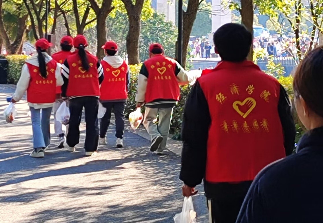 下午两点,志愿者们到达了南山公园,义务清扫活动正式开始。志愿者们分为若干小组,到公园各处清扫垃圾。有的到广场中心,拾果皮纸屑。有的到花坛处,捡起瓶子和塑料袋。有的到公园小道,不放过一个角落。一名志愿者在清扫时,还遇到一个小朋友旁忙。每位志愿者都一丝不苟,认真细致地把每个角落尽力打扫干净,并把垃圾分类好,扔进垃圾桶。有人对志愿者们赞扬肯定——像雷锋般闪耀光芒,有人把志愿者们当榜样教育孩子,有人拍下志愿们清扫的身影。