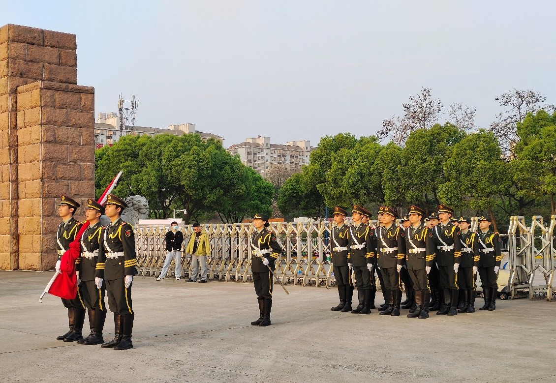 晨光熹微,全体学生准时来到西门广场前列队集合,昂首挺胸,肃穆而立,静待庄严时刻的到来。上午6时30分,随着军靴声、口号声由远及近,英姿挺拔的国旗护卫队护卫着鲜艳的五星红旗,迈着整齐划一、铿锵有力的步伐入场,升旗仪式正式开始。彤彤旭日,熠熠朝霞,伴随着雄壮激昂的《义勇军进行曲》,五星红旗冉冉升起,随风飘扬,全体学生高唱国歌,行注目礼。