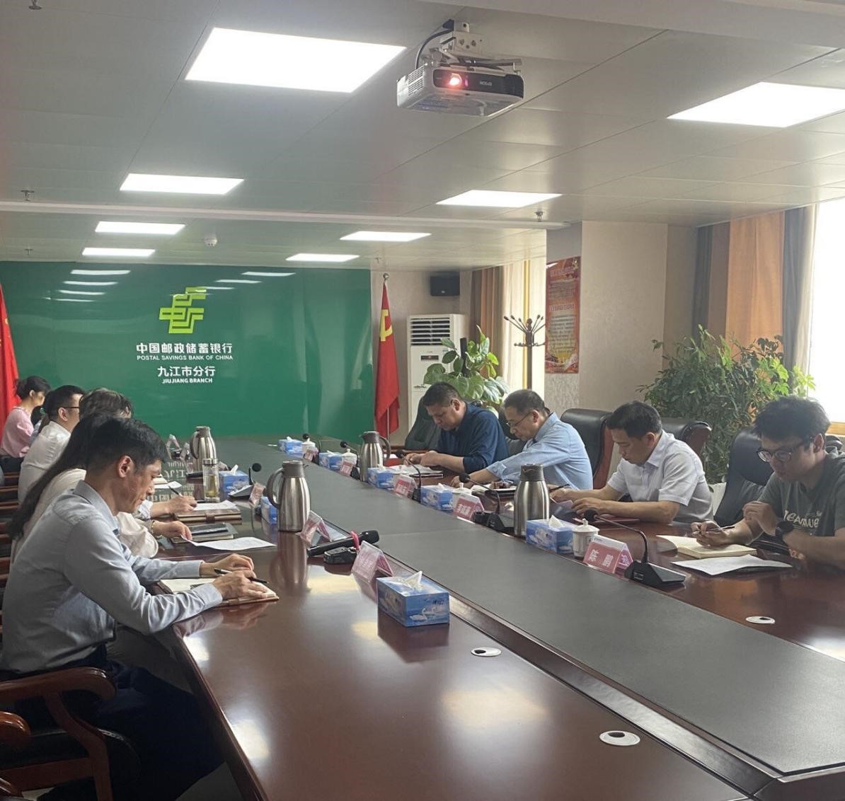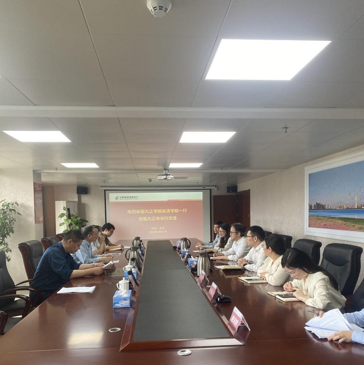 4月21日,pg游戏电子模拟器党委书记漆晗东、金融学教研室主任李拔豪、实验室主任陈鹏等一行赴邮政储蓄银行九江分行开展“访企拓岗”专项行动,并就学生实习就业工作进行座谈。邮政储蓄银行九江市分行党委书记、行长徐洋远、副行长万为兵,以及各重点业务条线负责人参加了座谈。