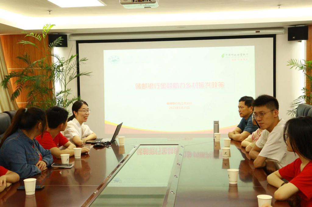 首先,在邮储银行甘苏主任的带领下,实践队一行参观了邮政银行九江分行。随后在调研会上,甘主任详细介绍了,近几年邮储银行九江分行结合自身实际、因地制宜,在助力乡村振兴方面推出的一系列惠农惠民的金融产品,为乡村振兴提供了便捷高效的信贷服务,扩大了普惠金融的覆盖面。