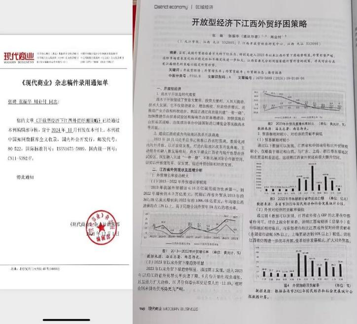 “人生不设限,挑战无边界”,不止步于现有的成绩,不断超越自我,在老师的指导帮助下,在《现代商业》核心期刊上发表了《开放型经济下江西外贸纾困策略》学术论文。作为新时代的新青年,坚持“用爱心去关怀,用行动去奉献”的理念,充满热情和责任感,积极付诸行动参与志愿服务。在寒暑假期间,积极参与到环保公益志愿服务中,和志愿者们进行户外清洁活动,宣传环保知识,呼吁大家爱护环境,共同守护美丽家园;主动前往养老院做志愿服务,陪老人聊天,为老人提供帮助,给他们带去关怀与温暖。她认为在志愿服务的路上,走的每一步都有意义。