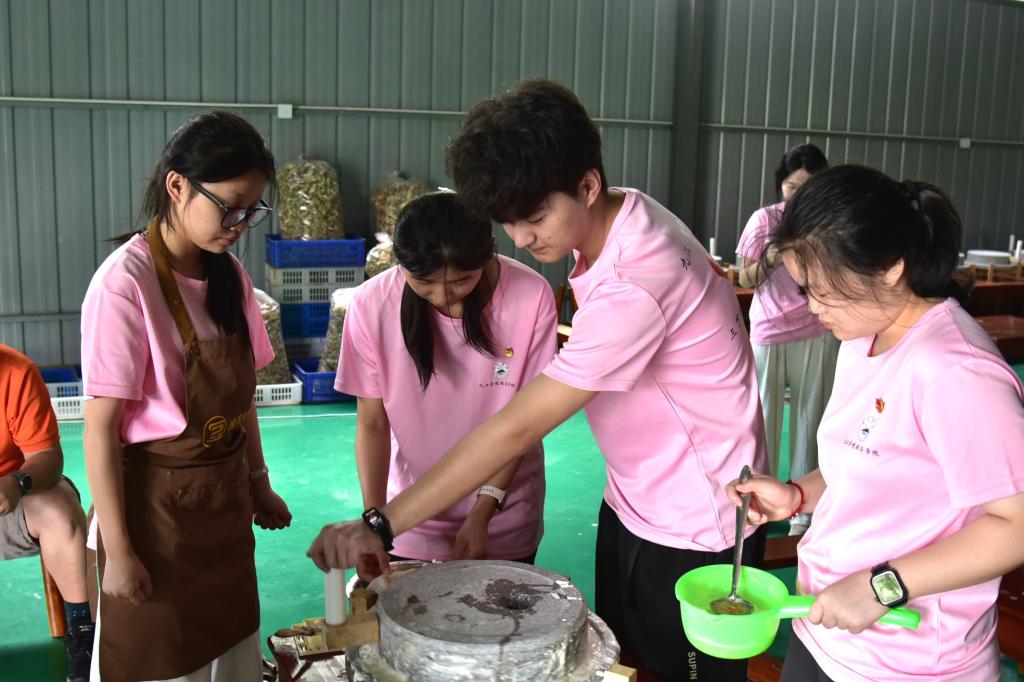 6月26日,实践队走进流芳乡开启非遗传承实践活动。上午,队员们运用各类豆类原料进行豆画拼接创作,将pg游戏电子模拟器院徽、美好愿景等元素融入作品,感受民间智慧与传统技艺的创新融合。下午,队员们走进当地非遗工坊,亲身体验豆腐制作全过程,从挑选黄豆到石磨磨浆再到柴火灶煮浆点卤、压制成型,在豆香四溢中领悟古法技艺的匠心传承,探索非遗文化赋能乡村振兴的新路径。