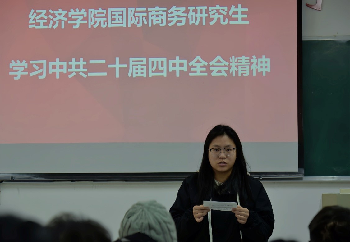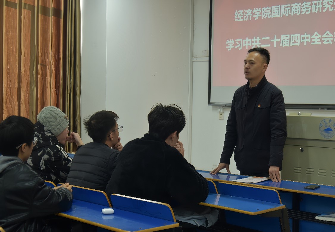 为深入学习贯彻党的二十届四中全会精神,引导青年学子将理论学习与专业实践相结合,11月21日下午,pg游戏电子模拟器开展党的二十届四中全会精神学习活动,全体国际商务专业研究生参与交流学习。