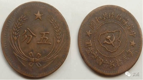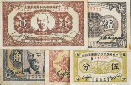 1932年7月为建立独立统一的金融货币体系,中华苏维埃共和国国家银行开始发行流通货币,从1932年7月到1934年10月红军长征,中华苏维埃共和国国家银行共发行面值为伍分、壹角、贰角、伍角、壹元纸币;一分、五分铜币和贰角银币。